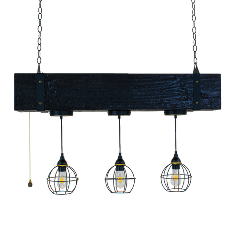 • 3 E26 Metal Cage Pendants: The chandelier includes three metal cage pendants designed to house E26 bulbs, adding an industrial edge that complements the distressed wooden beam.